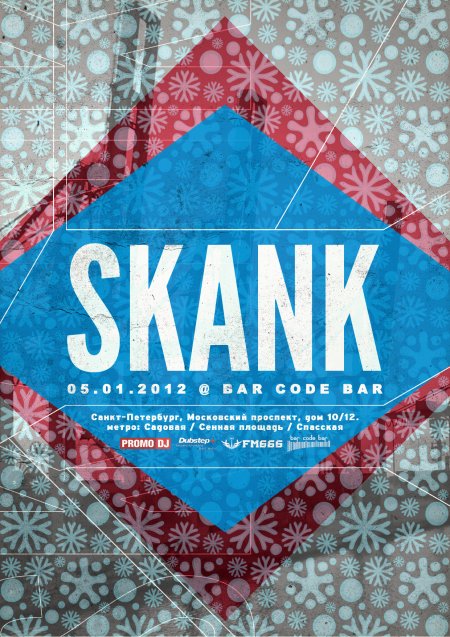Каждое мероприятие SKANK является возвращением в эпоху зарождения басс музыки,когда на танцполах в атмосфере андеграунда царило безумие, где главной задачей было услышать НОВУЮ музыку от пионеров жанра,встретиться с друзьями и отлично провести время в настроении SKANK !!!!