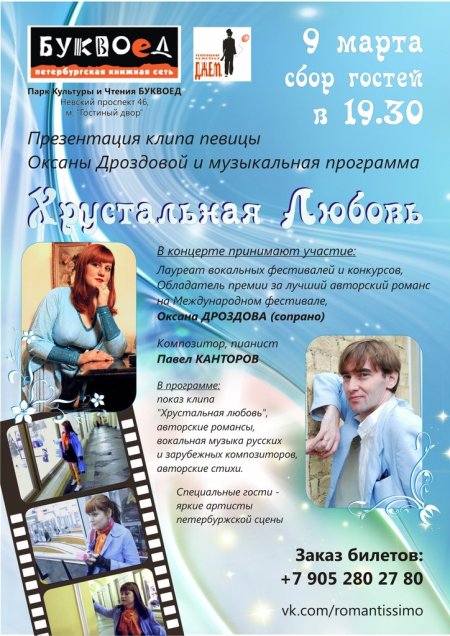 9 марта 2012 года в Санкт - Петербурге состоится УНИКАЛЬНОЕ СОБЫТИЕ - концертная программа и презентация музыкального клипа - всему этому действу имя - "ХРУСТАЛЬНАЯ ЛЮБОВЬ"! Для вас споёт певица - волшебница, Лауреат вокальных конкурсов и фестивалей Оксана Дроздова (сопрано), сыграет композитор Павел Канторов а так же выступят приглашённые гости - яркие артисты петербуржской сцены! Будет красиво, музыкально, солнечно! Начало в 19 часов. Заказ билетов: Адрес: ст. метро "Гостиный двор", Буквоед, Невский - 46, Парк Культуры и Чтения. (Билеты можно приобрести и на входе).
