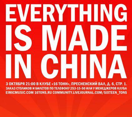 На счету у Everything Is Made In China множество восторженных отзывов прессы, ряд успешных концертов в клубах Москвы и выступление на разогреве у культовых британцев 65 Days Of Static. Но главное событие для группы – это, конечно же, выход альбома. Диск записывался летом, причем работа над ним шла в Канаде, в студии Chemical Sound - такой подход к делу для нашей инди-сцены пока является беспрецендентным. Получившийся в итоге альбом "4" приятно удивляет качеством и эклектичностью: мелодичные песни здесь сменяются протяжными инструменталами, а атмосферно-пространные гитарные полотна органично соседствует с драйвовыми инди-поп-песнями.