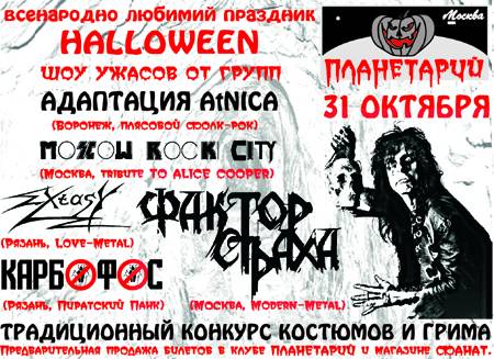 В этом году всенародно любимый праздник будем отмечать с особым размахом. Весь клуб в эту ночь преобразится до неузнаваемости. Вы попадёте если не в ад, то, как минимум, в пещеру страха. Кстати, главными персонажами, как водится, станут сами посетители. Московская группа MOSCOW ROCK CITY везёт к нам знаменитое шоу ужасов великого ЭЛИСА КУПЕРА. Окончательно укомплектован состав участников. Любителей металла ждёт приятный сюрприз - группа ФАКТОР СТРАХА