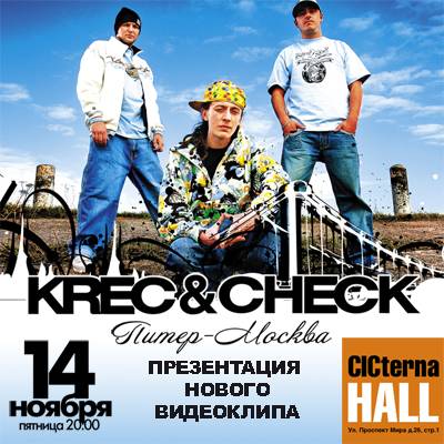 14 ноября в клубе «CICterna HALL» состоится концерт KREC & CHECK. «Питер - Москва», две столицы, два стиля. Светлая питерская лирика и московский динамический стаил дают такой коктейль эмоции, который заставляет не стоять на месте, а тихо и безмятежно двигаться в ритм.