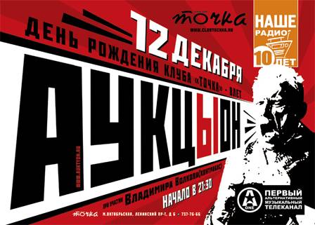 12 декабря 2008 года столичному клубу «Точка» исполнится 8 лет! Такой нешуточный возраст может говорить об одном: музыкальная жизнь клуба развивается и с каждым годом становится интереснее и разнообразнее. В этот раз преподнести свой музыкальный подарок приедет питерская группа «АукцЫон» с большим сольным концертом.