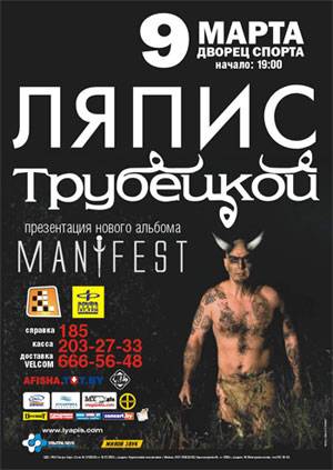 Ляписы, уже практически отколесившие по просторам России со своей новой программой, добрались-таки до Беларуси. 9 марта группа "Ляпис Трубецкой" даст большой двухчасовой концерт с программой "Манифест" в минском Дворце Спорта. Помимо этого в первой половине марта коллектив даст сольные концерты с этой программой в Бресте, Гродно, Могилеве, Гомеле, Новополоцке, Солигорске и Бобруйске.