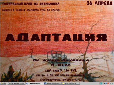 Концерт группы Адаптация из Казахстана!!!Билеты по 150 рублей,приобретать в ДК Ж или у распостронителей тел. 8-912-840-8759, 8-912-357-6497.