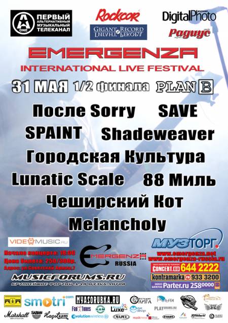 ГЛАВНЫЙ КОНЦЕРТ ГОРОДСКОЙ КУЛЬТУРЫ ЭТОЙ ВЕСНЫ СОСТОИТСЯ 31 МАЯ В РАМКАХ ФЕСТИВАЛЯ EMERGENZA В КЛУБЕ PLAN B!!!