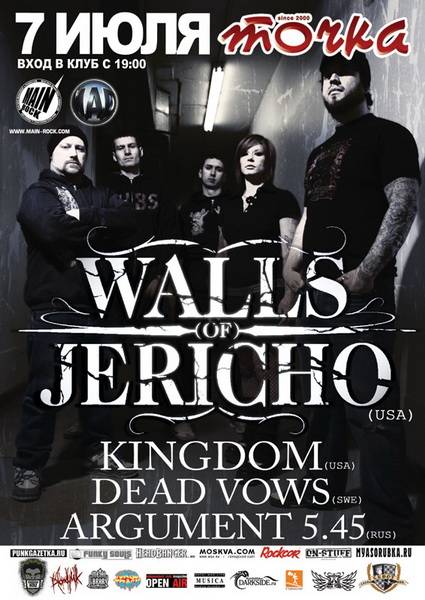7 июля в московском клубе «Точка» будет жарко! Московские слушатели смогут снова увидеть и услышать группу WALLS OF JERICHO (USA), а также, XKINGDOMX (USA), DEAD VOWS (Swe), ARGUMENT 5.45 (Москва).