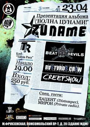 Презентация новой пятой по счету пластинки под названием «Волна Цунами». Поддержат команду группы Creepshow (Панк с женским вокалом, Тула), Beat Devils(Punk-o-billy, Москва) и молодая Bastars Crew. Zuname порадуют двухчасовым сетом, включающим в себя все песни с нового альбома плюс старые, проверенные временем хиты.