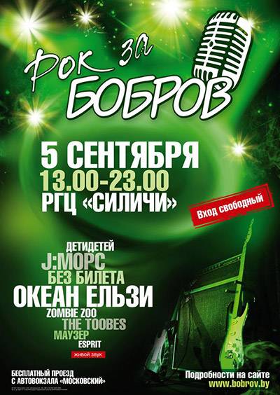 Таким образом «Бобров» намерен привлечь внимание молодежи к проблемам окружающей среды и показать пример, которому стоит следовать. И в этом ему помогут популярные исполнители. На фестивале выступят «Mauzer», «Esprit», «The Toobes», «Zombie Zoo», «Детидетей», «Без Билета», «J:морс» и «Океан Ельзи». Кроме отличной музыки в течение дня посетителей ожидают всевозможные конкурсы, развлечения и сюрпризы.