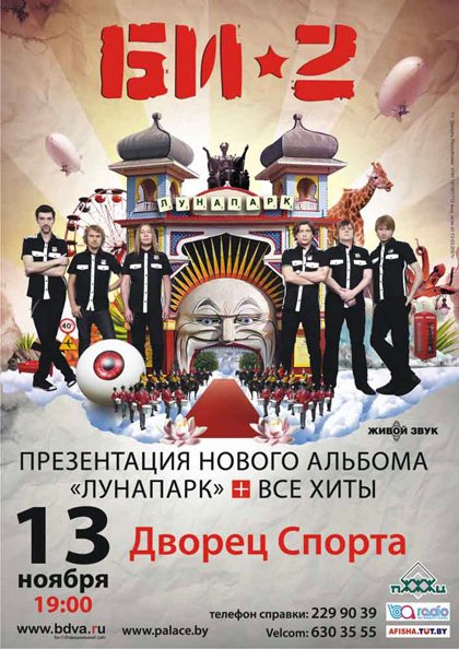 Пройдя большой и успешный творческий путь, музыканты прочно утвердились в статусе рок-звезд: они сумели покорить вершины эфиров российских радиостанций с первых синглов, попали в саундтрек к фильму «Брат-2», оказались в списке хедлайнеров фестиваля Максидром, записали огромное количество мультиплатиновых пластинок, получили World Music Award, сделали 2 сайд-проекта с элитой российской рок-музыки, стали пропагандистами зарубежной инди-сцены, провели собственный музыкальный фестиваль и, наконец, первыми спели актуальный диско-панк по-русски. Но даже утвердившись в статусе российских рок-звезд, «Би-2» остаются верны своему фирменному стилю и высокому уровню западной музыки, что найдет свое подтверждение в новом альбоме «Лунопарк» и его белорусской презентации. Потому огромное число почитателей должно только порадоваться тому, что снова получили альбом, который не сможет их разочаровать и обмануть ожидания. Он уже успел заслужить восторженные отклики как поклонников творчества, так и именитых музыкальных критиков. Последние называют альбом самым мощным за всю историю группы и отмечают, что музыканты «почти по цирковому умело жонглируют самой разной музыкой».