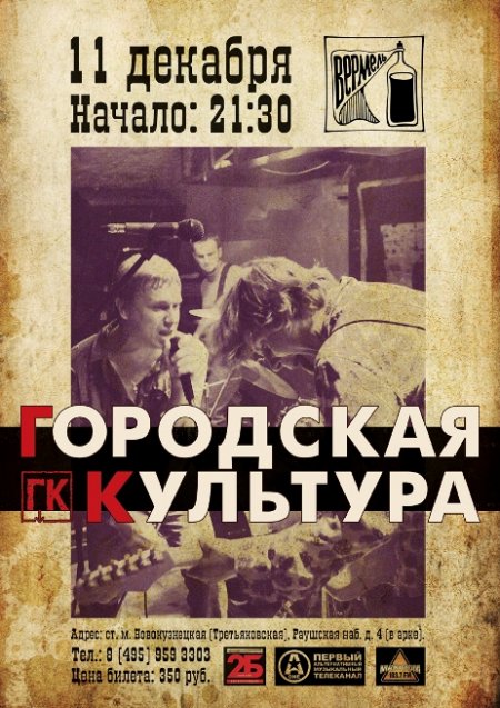 Последний концерт Городской Культуры в 2009 году! Адрес: Раушская наб., 4, м.Новокузнецкая Вход: 350 р.