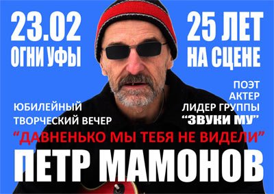 Одна из самых загадочных личностей на рок-сцене 80-х и 90-х, бессменный лидер группы «Звуки Му», легендарная звезда, слухи о которой ходят по всей России, эксцентричный и просто талантливый человек, философ, поэт, автор песен "Муха- источник заразы" и "Шуба-дуба блюз", на которых вырос весь отечественный панк, киноактер, великолепно сыгравший в культовых фильмах "Остров" и "Царь", настоящий мастер концертов и спектаклей, Петр Мамонов стал одним из тех, чьи песни остаются актуальными и интересными по сей день. А потому организованные Петром Мамоновым творческие вечера привлекают к себе внимание всех ценителей наполненных философскими размышлениями и пропитанных экзистенциализмом поэзии и музыки. Одним из таких событий станет творческий вечер Петра Мамонова в РК Огни Уфы. Поэт и музыкант выступит на сцене с юбилейной программой «Давненько мы тебя не видели…», посвященной 25-летию творческой деятельности артиста.