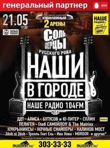 В этом году фестиваль «НАШИ В ГОРОДЕ!» разбудит Ваш музыкальный аппетит! На большой арене ДС Юбилейный (ПЕРЦЫ) выступят ДДТ, Сплин, Ночные Снайперы, Вячеслав Бутусов и группа Ю-Питер, Чиж и Ко. Здесь же состоится и выступление группы Matrixx, являющейся сольным проектом Глеба Самойлова из недавно завершившей свою историю группы Агата Кристи.