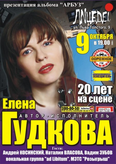 9 октября нынешнего года в новом здании театра «Лицедеи» состоится праздничный концерт известной петербургской певицы, поэта, композитора Елены Гудковой.
