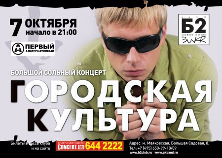 Городская Культура открывает клубный сезон 2010/2011 большим сольным концертом в клубе Б2! Стоимость билетов: в предварительной продаже: 400 в день мероприятия: 500 Адрес клуба: м. Маяковская, Большая Садовая, 8 Тел: Ƶ (495) 650-99-18/09