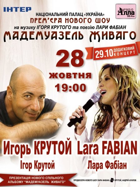 28 октября 2010 года в Национальном дворце «Украина» состоится один из самых громких музыкальных проектов - фантастический концерт Лары Фабиан и Игоря Крутого!!!