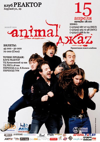 15 апреля в клубе "Реактор" группа “Animal ДЖАz” с презентацией нового альбома. Билеты: 45/50 тыс. (предварительно), 70 тыс. (vip). Места продажи: касса клуба, переход на пл. Я.Коласа, переход ГУМ, ТЦ Купаловский пав 19, ТЦ Рига пав. 18