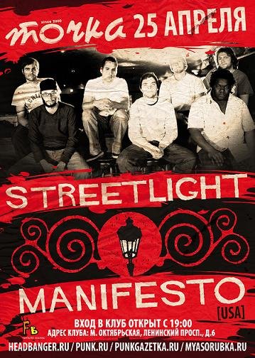 Единственный концерт в России одной из лучших мировых американских ска-панк групп. Команда добилась большого успеха в альтернативных кругах. Музыка сочетает элементы ска третьей волны с широким спектром других жанров, что отличает Streetlight от аналогичных групп. Они выпустили первый альбом, Everything Goes Numb (Victory Records) 26 августа 2003. Дали первый концерт в Рутгерском Университете в Нью-Брансуике, Нью-Джерси, 9 декабря 2003. Некоторые члены Streetlight Manifesto были широко известны в ска-коммьюнити Нью-Джерси благодаря участию в прошлых проектах, в первую очередь Кэлноки из Catch 22.