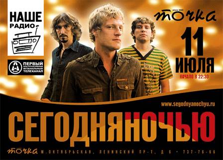 Теплым летним вечером – 11 июля - в московском клубе «Точка» состоится большой сольный концерт романтическо-лирического содержания и настроения, что традиционно для группы «Сегодняночью».