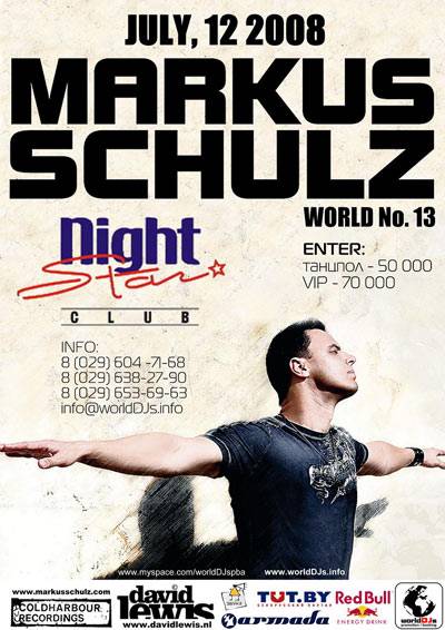 12 июля 2008 года в клубе «Night Star» состоится долгожданное и единственное выступление DJ Маркуса Шульца в Беларуси. Впервые этот мастер представит свой специальный сет для белорусских клабберов.