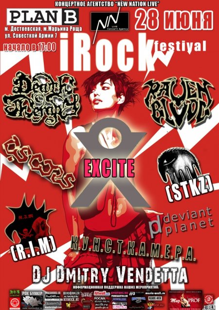 Группа Excite сыграет получасовой сет в рамках фестиваля iRock Fest. Начало концерта в 17:00, Excite выйдет на сцену в 20:40. Вход по флаеру 300 рублей или 350 без него.