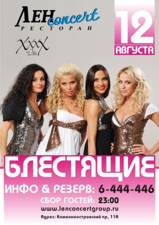 12 августа одна из самых прекрасных во всех отношениях групп отечественного шоу-бизнеса – «Блестящие»- выступит в ЛенСoncert’e!