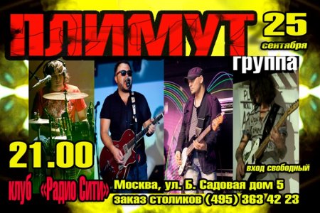 ПЛИМУТ-рок , открывает сезон, 25 сентября в клубе "Радио-Сити", во время вечеринки произойти может много неожиданнстей, причиной тому День рождения идейного вдохновителя , автора музыки и песен группы Товарища ПЛИМУТ, который живет и творит в непрерывной тяге к новому, не скрывая своей экспрессивности и экстраординарности.